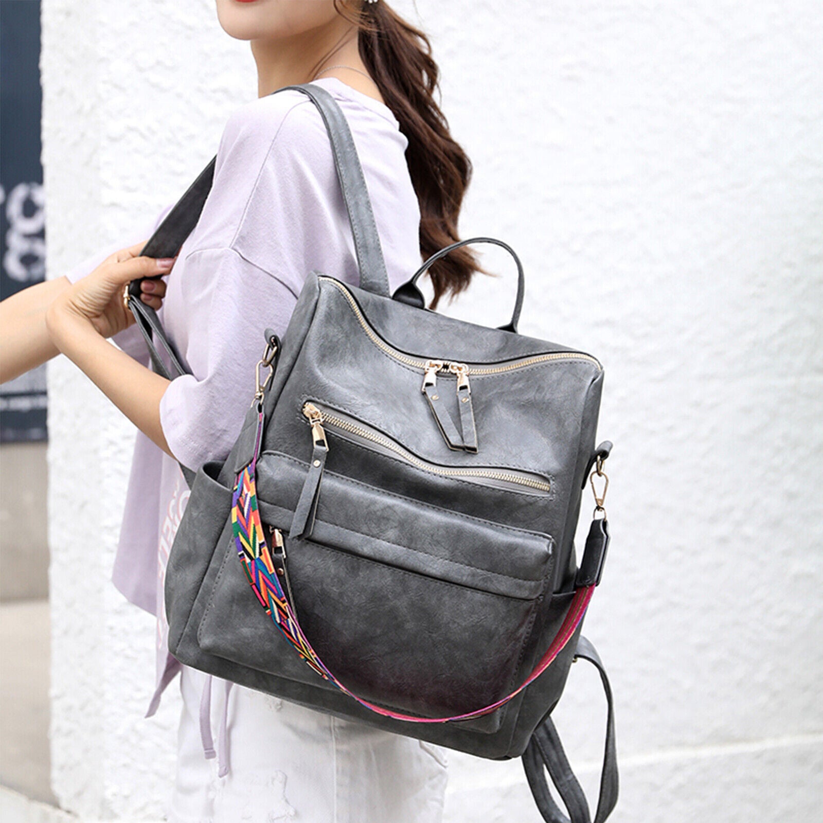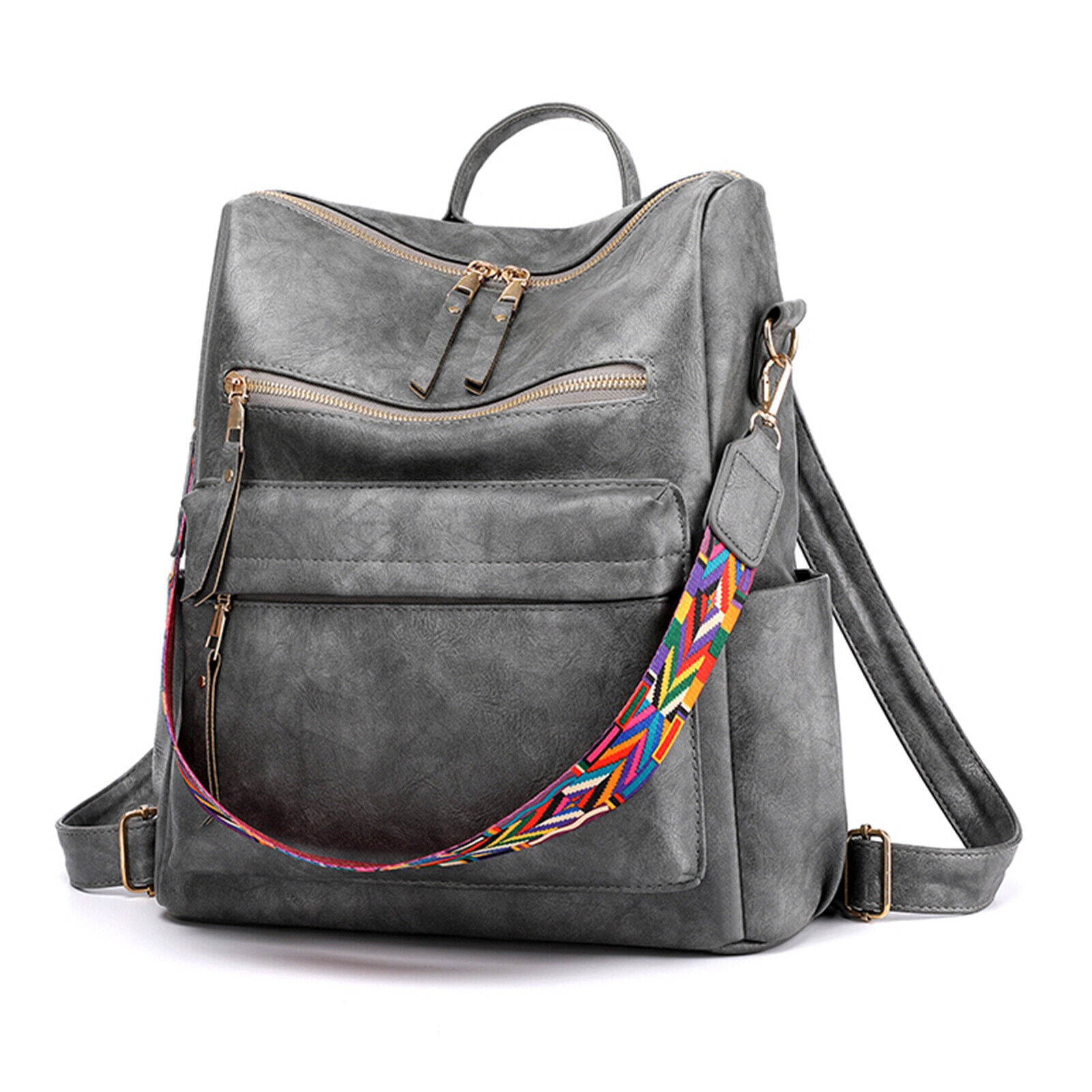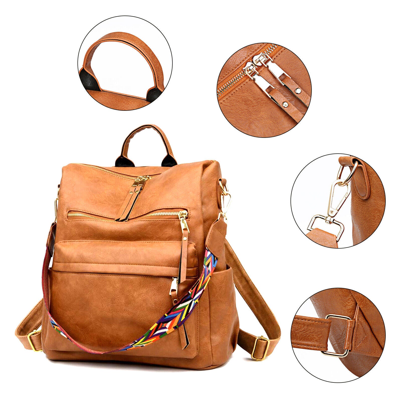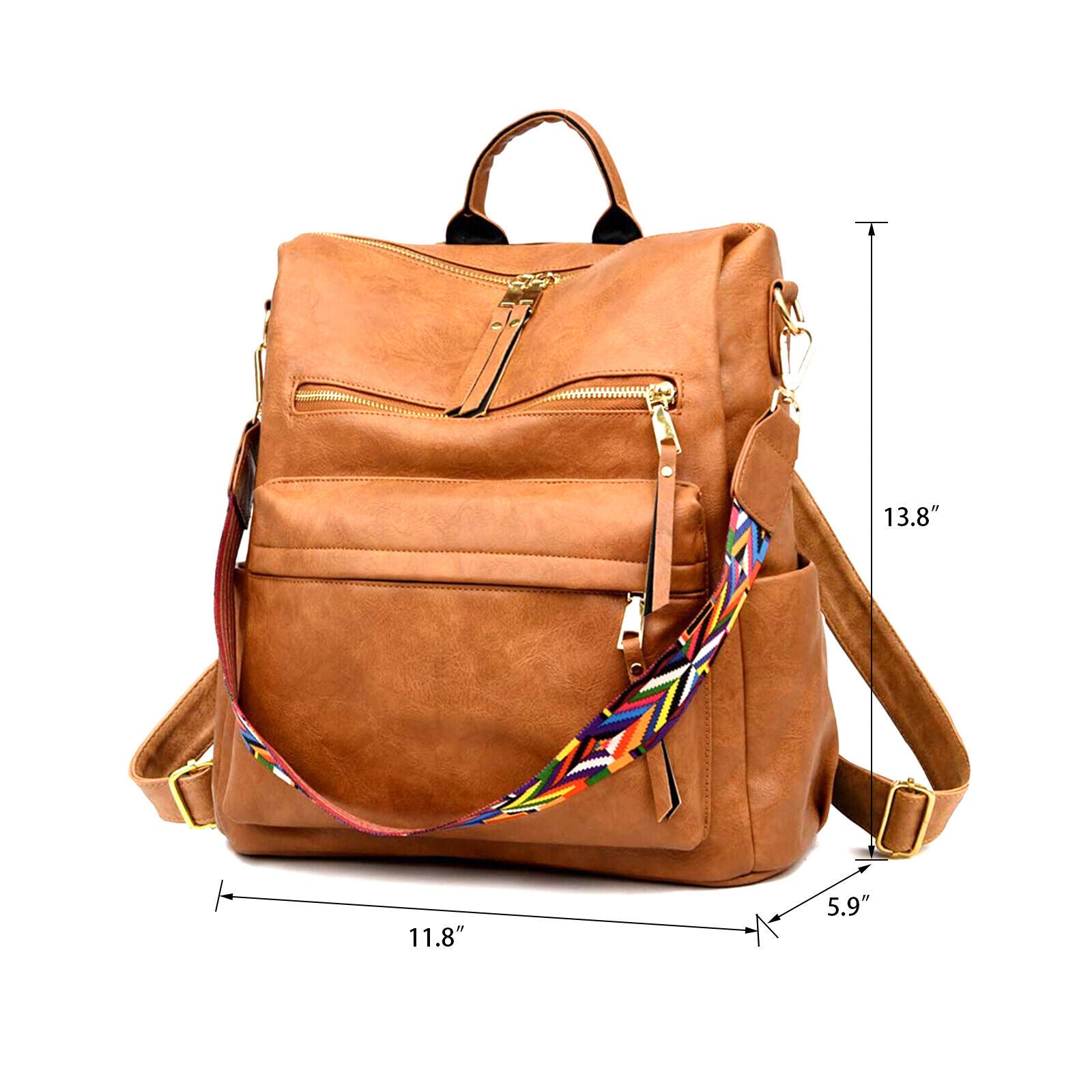 Product DescriptionThis retro backpack is made of high-quality PU material and metal hardware zippers. The waterproof PU material and exquisite workmanship ensure the high quality of the backpack. A removable colorful strap not only makes it fashionable in style but also can convert it into a shoulder bag. It is perfect for carrying daily items or short trips, and also an ideal gift for friends.FeaturesHigh-quality MaterialThe backpack is made of PU material which is waterproof and wear-resistant. The touch of it is medium soft, and it will not be easy to deform. The zipper is smooth and durable and hardware is abrasion-proof and anti-corrosive, and high-quality material provides bright color.Exquisite DetailsThe handle on the top is ergonomically designed with appropriate width and radian which makes it comfortable to pick it up. Double-zipper design is convenient for you to open in two directions. In addition, its detailed streamlined stitching makes it smooth, neat and even.Multifunctional DesignThis 3-in-1 bag combines backpack, shoulder bag, top-handed bag in one. You can use it as a normal fashion backpack with 2 back straps; With a removable shoulder strap, you can convert it to a casual shoulder bag; Also, it can be used as a hand bag with a soft handle.Practical StructureThis bag has a main zipper compartment with 3 small inner pockets. And it also has 3 zipper pockets outside, includes 2 zipper pockets on the front for you to store small items and 1 anti-theft zipper pocket on the back. The 2 slip pocket on both sides can hold water cups, umbrellas, keys etc. It features a large capacity that can hold small daily items, magazines, iPad etc, perfect for your everyday life.Elegant AppearanceIt is a backpack with 2 straps which features classic and elegant look. Our backpack has 1 removable colorful strap, which is fashionable and beautiful. It is not only functional but also a lovely gift for birthdays, anniversaries, etc.Specification◆Type: Backpack◆Material: PU Leather◆Net Weight: 1.76lbs◆Dimensions:11.81x5.90x13.78inch (L x W x H)Package Included1 x BackpackPlease note:Size may be slight inaccuracy due to hand measurementColor may be little different due to monitors. Please take real product as standard