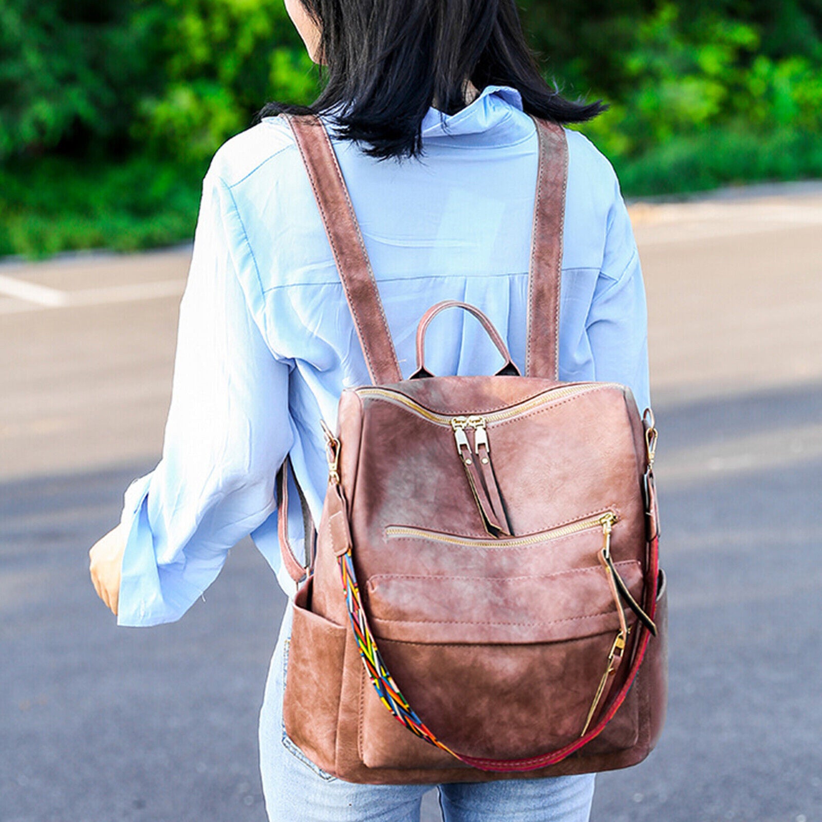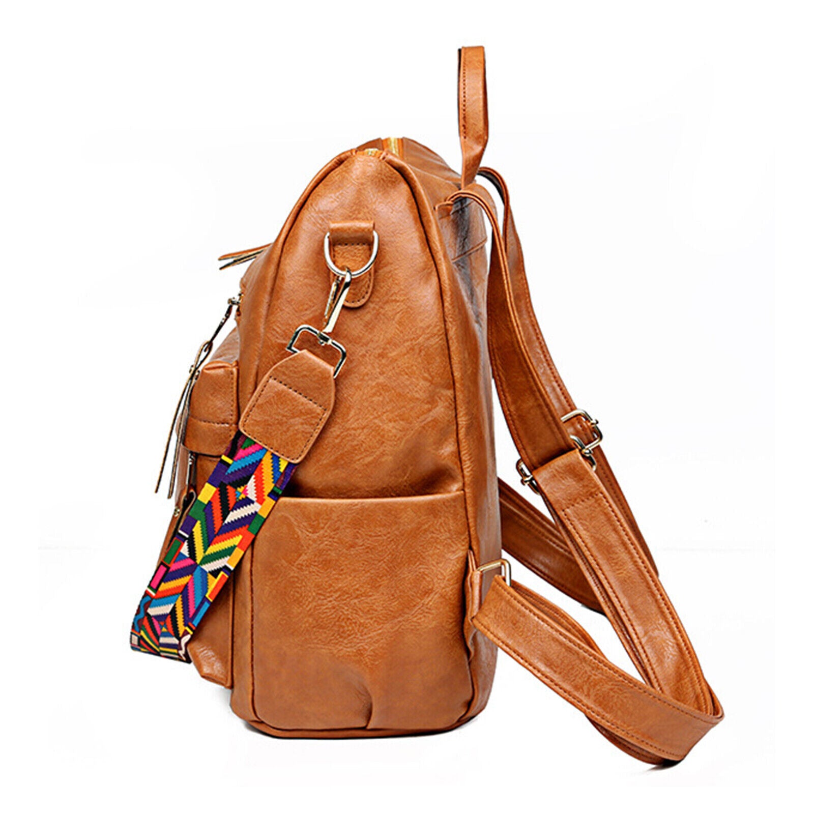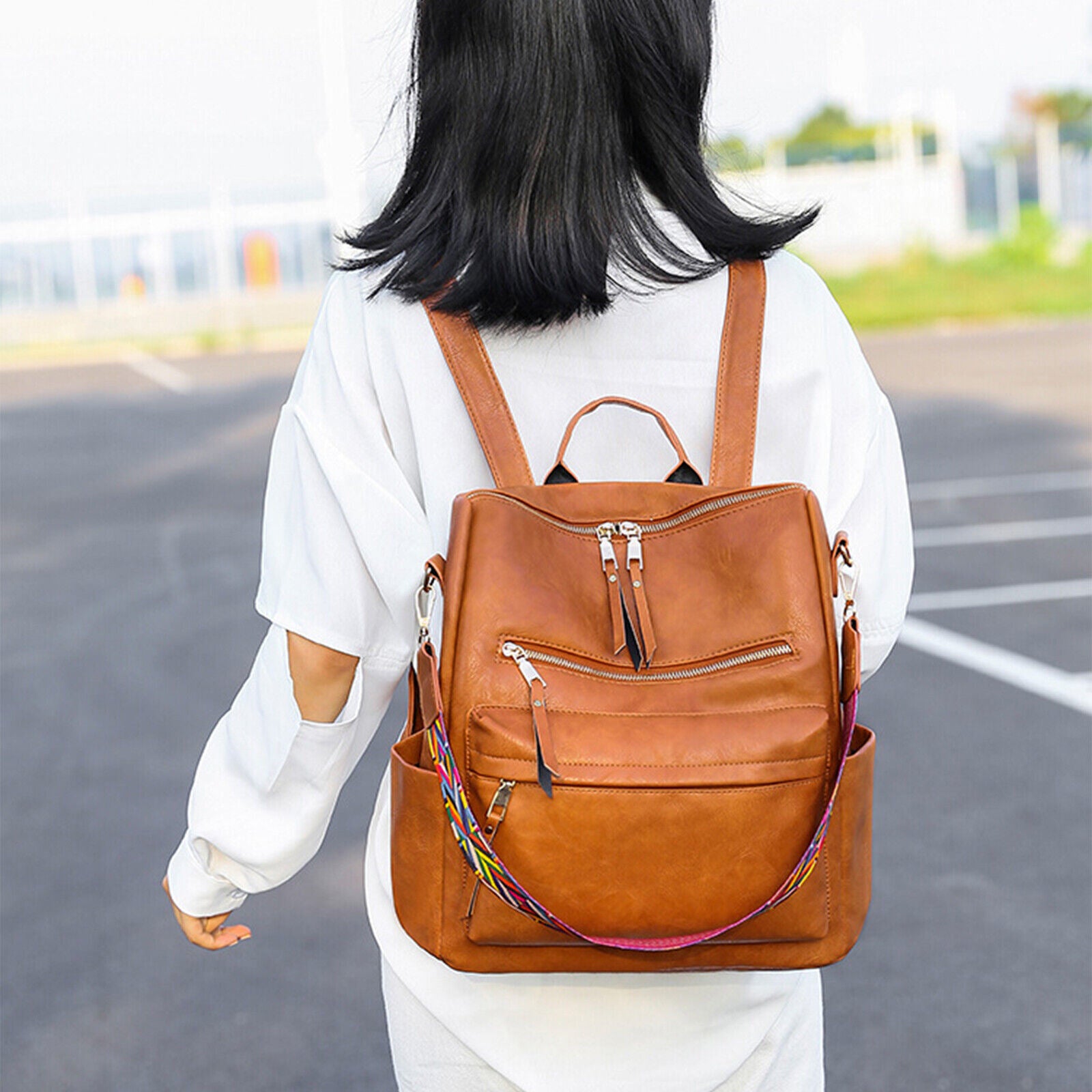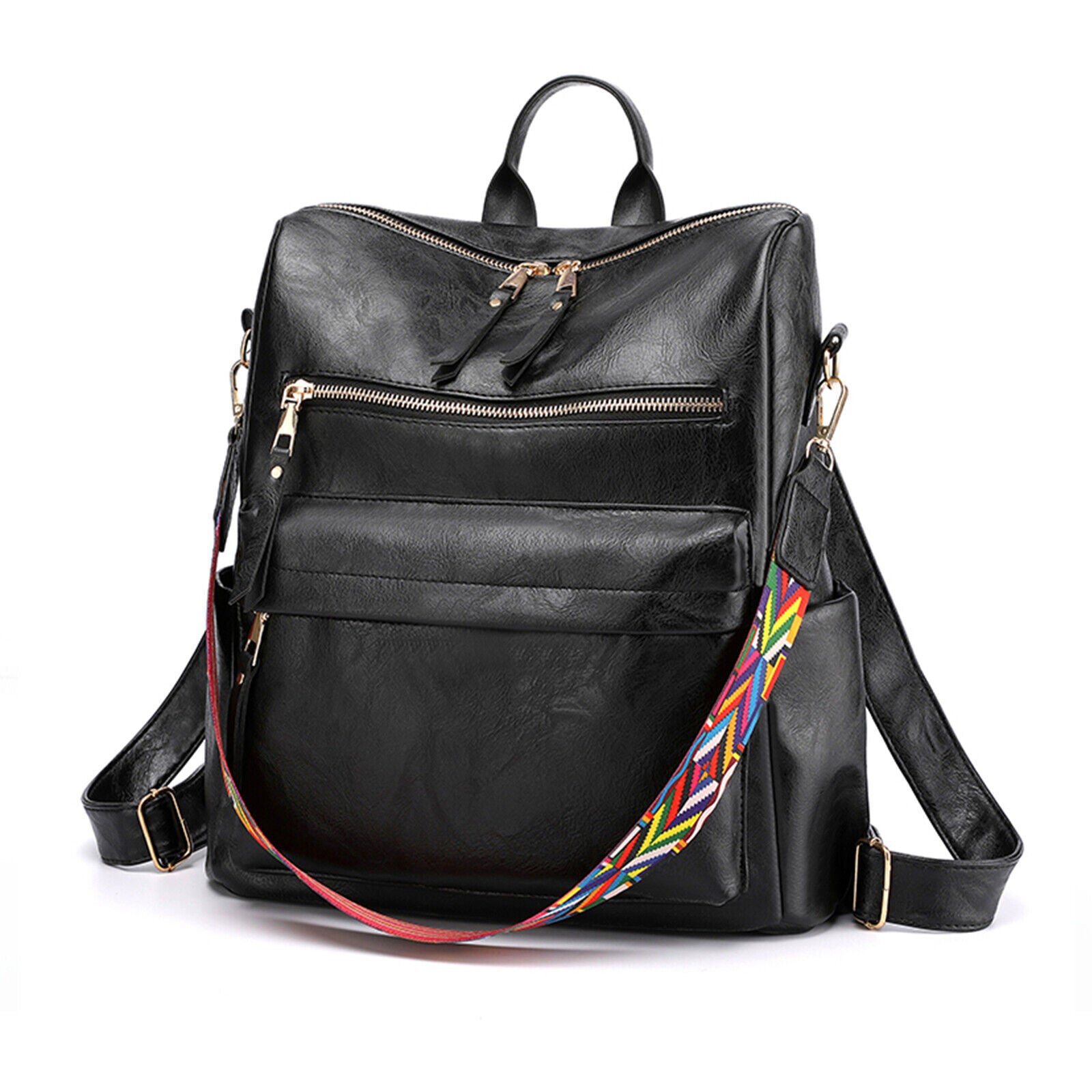 Product DescriptionThis retro backpack is made of high-quality PU material and metal hardware zippers. The waterproof PU material and exquisite workmanship ensure the high quality of the backpack. A removable colorful strap not only makes it fashionable in style but also can convert it into a shoulder bag. It is perfect for carrying daily items or short trips, and also an ideal gift for friends.FeaturesHigh-quality MaterialThe backpack is made of PU material which is waterproof and wear-resistant. The touch of it is medium soft, and it will not be easy to deform. The zipper is smooth and durable and hardware is abrasion-proof and anti-corrosive, and high-quality material provides bright color.Exquisite DetailsThe handle on the top is ergonomically designed with appropriate width and radian which makes it comfortable to pick it up. Double-zipper design is convenient for you to open in two directions. In addition, its detailed streamlined stitching makes it smooth, neat and even.Multifunctional DesignThis 3-in-1 bag combines backpack, shoulder bag, top-handed bag in one. You can use it as a normal fashion backpack with 2 back straps; With a removable shoulder strap, you can convert it to a casual shoulder bag; Also, it can be used as a hand bag with a soft handle.Practical StructureThis bag has a main zipper compartment with 3 small inner pockets. And it also has 3 zipper pockets outside, includes 2 zipper pockets on the front for you to store small items and 1 anti-theft zipper pocket on the back. The 2 slip pocket on both sides can hold water cups, umbrellas, keys etc. It features a large capacity that can hold small daily items, magazines, iPad etc, perfect for your everyday life.Elegant AppearanceIt is a backpack with 2 straps which features classic and elegant look. Our backpack has 1 removable colorful strap, which is fashionable and beautiful. It is not only functional but also a lovely gift for birthdays, anniversaries, etc.Specification◆Type: Backpack◆Material: PU Leather◆Net Weight: 1.76lbs◆Dimensions:11.81x5.90x13.78inch (L x W x H)Package Included1 x BackpackPlease note:Size may be slight inaccuracy due to hand measurementColor may be little different due to monitors. Please take real product as standard