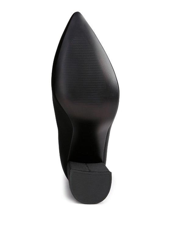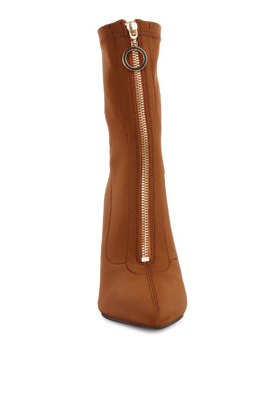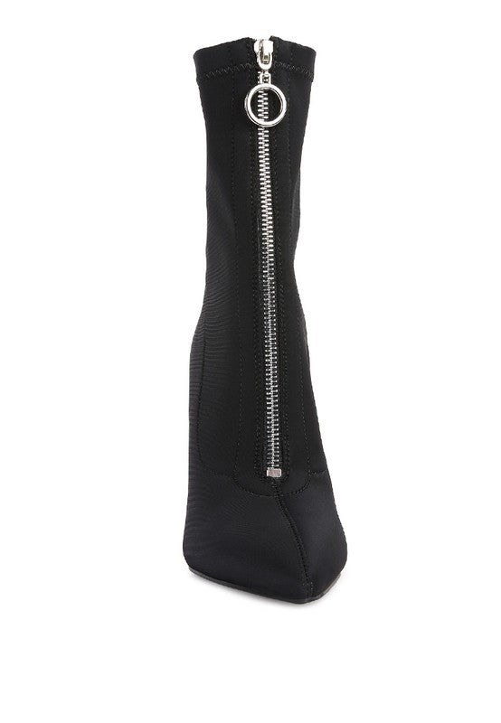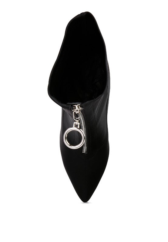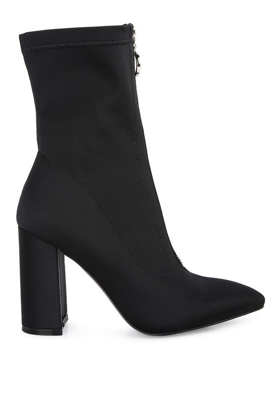 Block Heel Pointed Toe Ankle Boot with Metallic Zipper that runsat front adds to the beauty. The super stretch boot fits well and keeps feet warm.