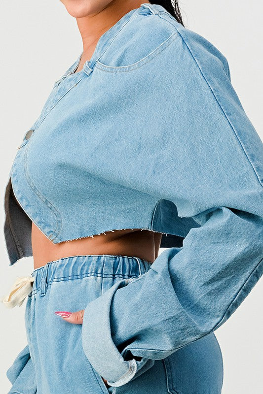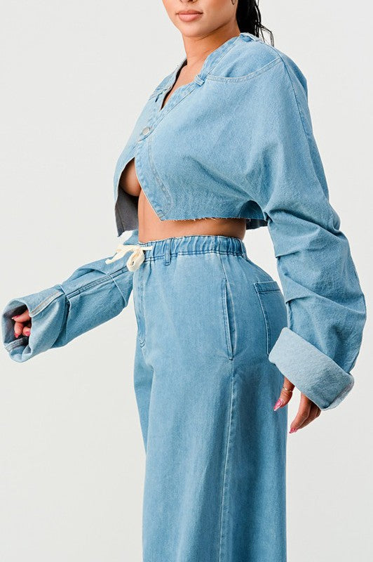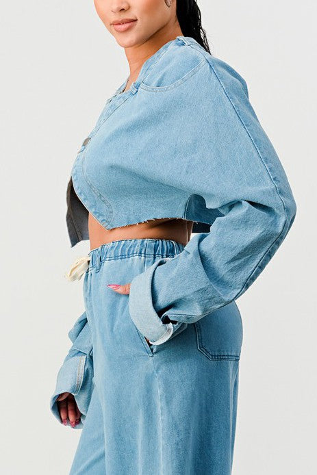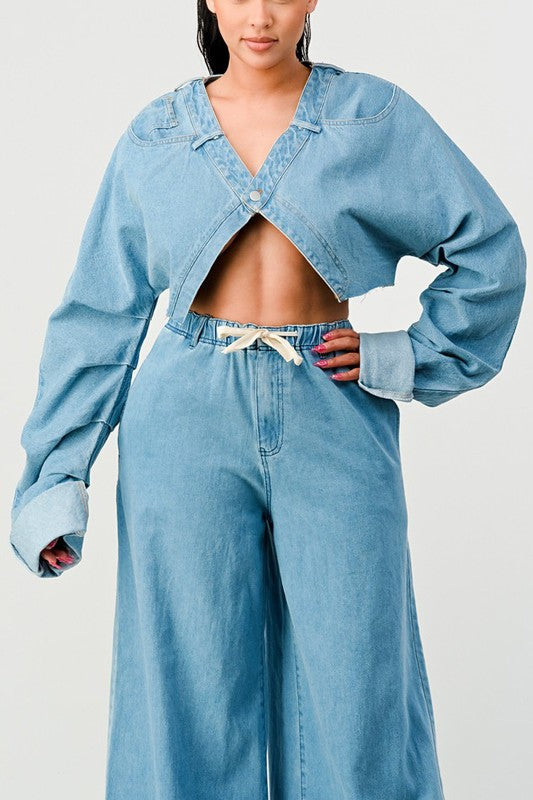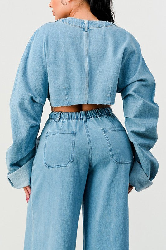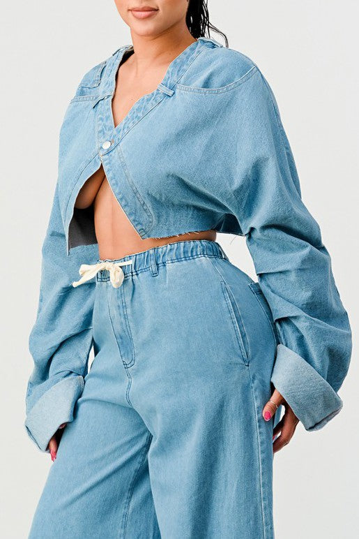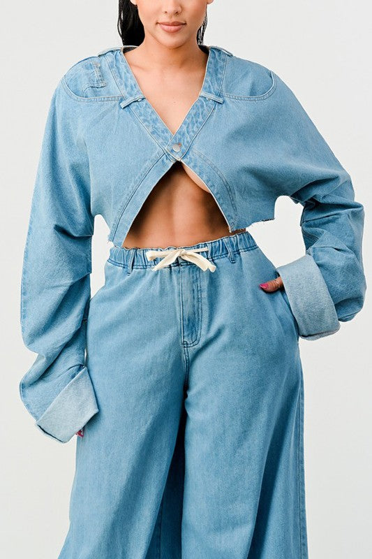 For a contemporary look that won't go out of style, opt for the Athina Irregular Denim Top. Crafted from durable denim, the top features cut-out detail, long sleeves, and a crop length that makes this piece perfect for any occasion. Imported