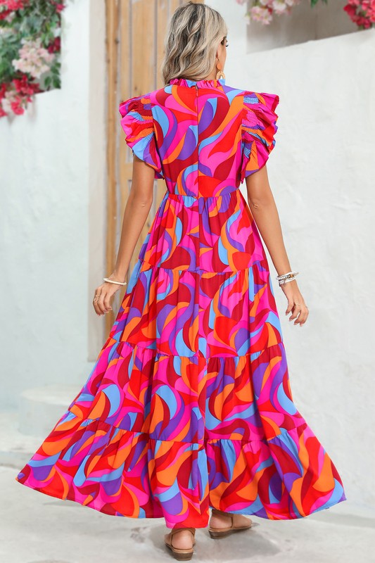 Abstract Print High Waist Ruffle Tiered Maxi Dress