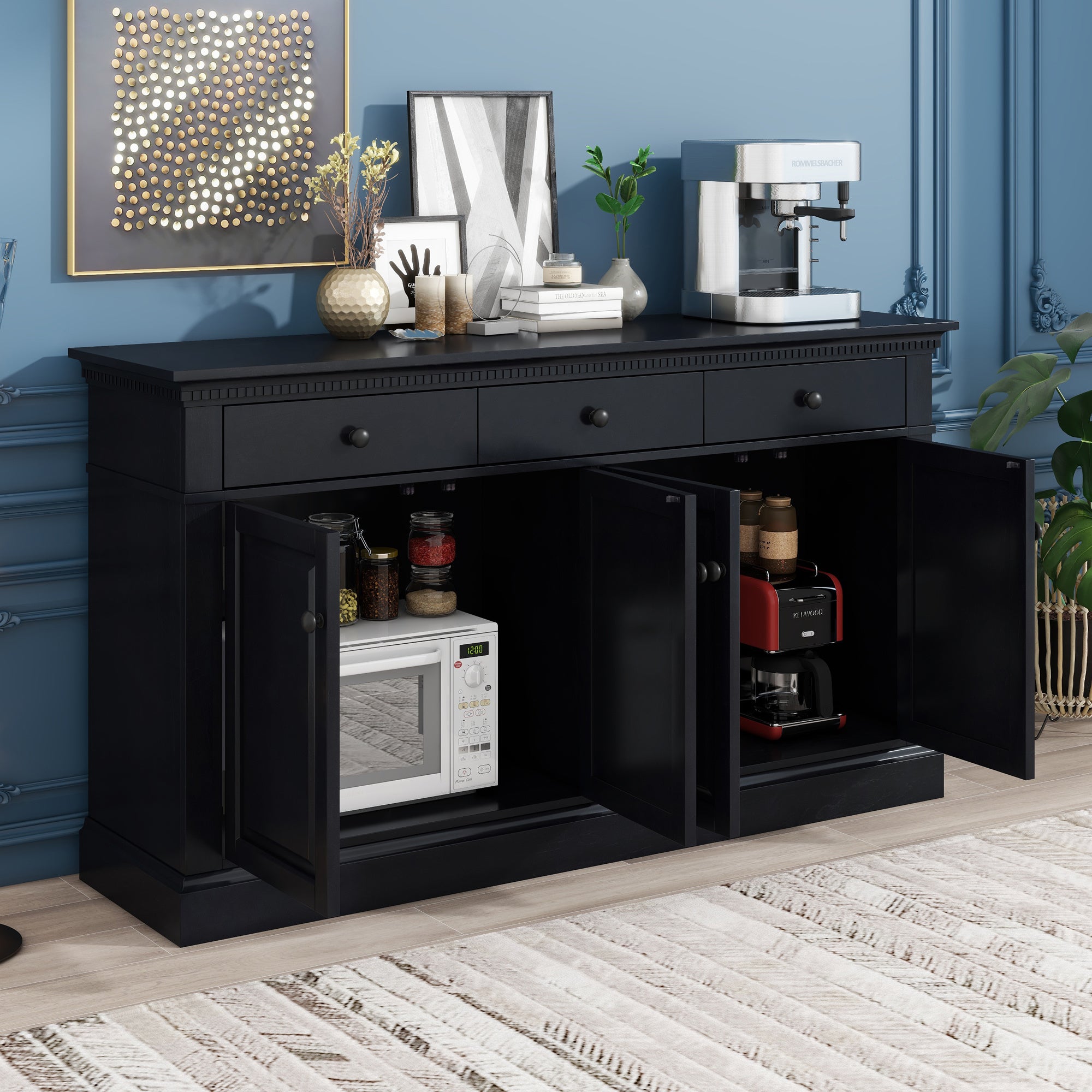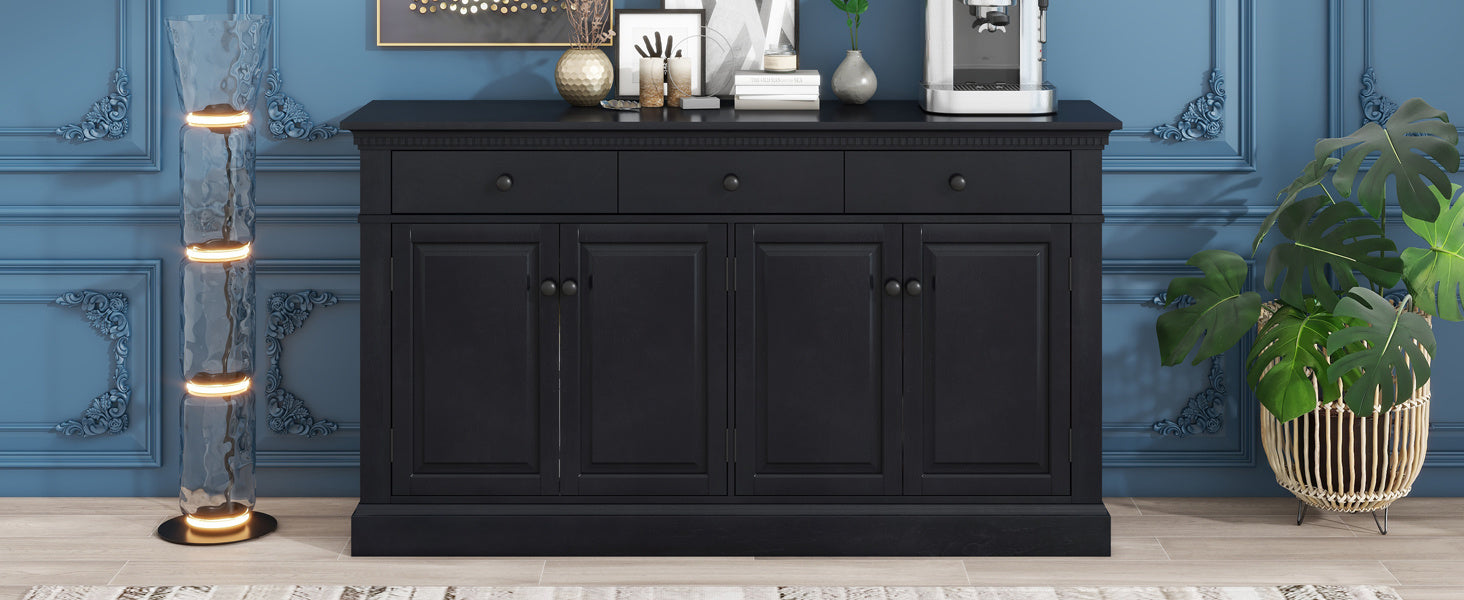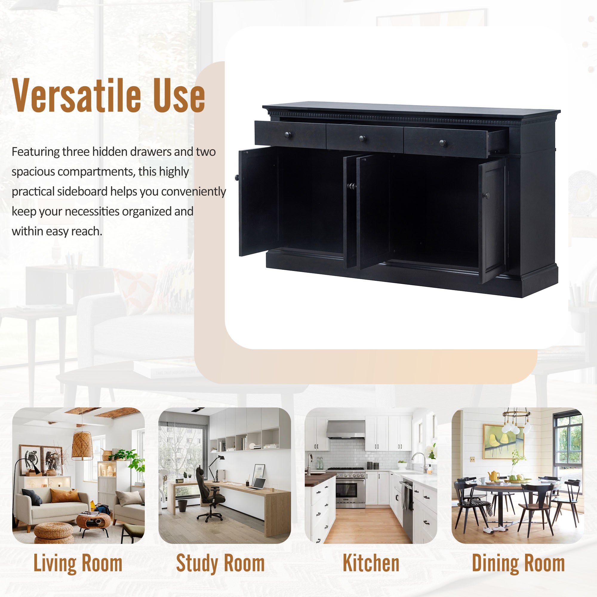 Versatile Use: Featuring three hidden drawers and two spacious compartments, this highly practical sideboard has a large capacity of storage, which can help you conveniently keep your miscellaneous items organized and your necessities within easy reach. The sleek design of this sideboard allows it to fulfill the function of storage cabinets and bookcases in living rooms and study rooms, but it can also be used for storing kitchenware in the kitchen and dining room.