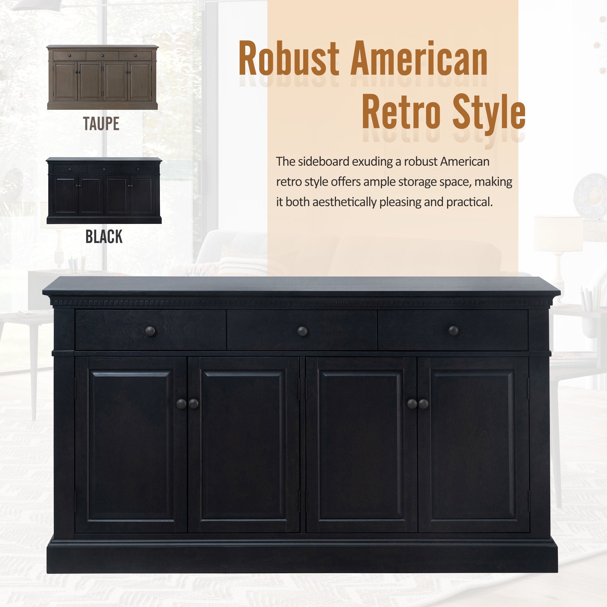 Robust American Retro Style: The sideboard exuding a robust American retro style offers ample storage space, making it aesthetically pleasing and practical. It is available in two colors: black and taupe. Black, a timelessly classic color, never goes out of style, and most consumers highly favor its sophisticated and elegant characteristics. Taupe, which is greatly in line with the current trend, is also favored by increasing consumers.