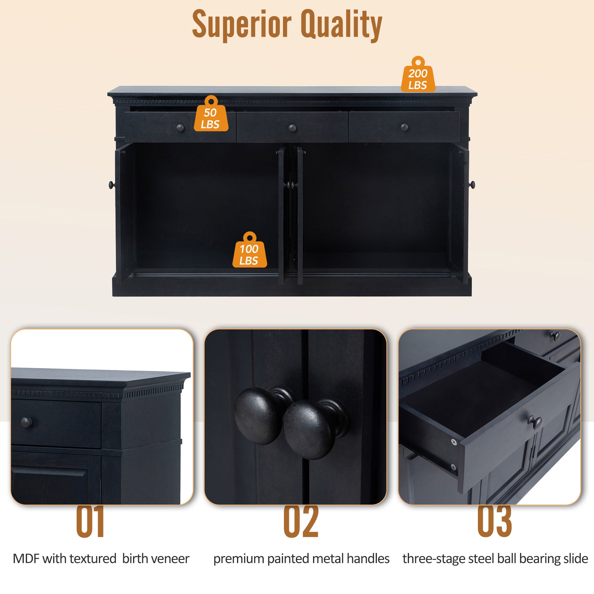 Superior Quality: The sideboard is made of high-quality MDF veneered with wooden textured birch, which undoubtedly ensures stability and durability. The drawer handles are made of premium metal and painted on the surface, adding texture to the overall product. The drawer uses a reliable three-stage steel ball-bearing slide, greatly increasing its smoothness and usability. The tabletop and drawers have a weight capacity of 200 lbs and 50 lbs respectively.
