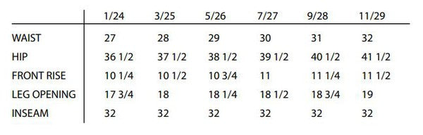 1: 27.0 (Waist), 36.5 (Hips), 32.0 (Inseam), null (Length)