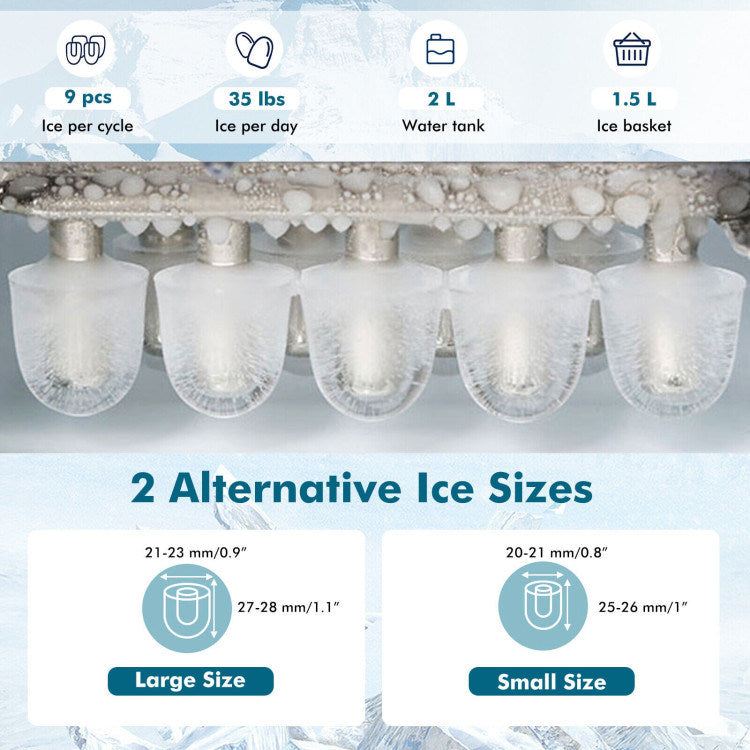 With a high-quality compressor; this electric ice maker takes only 6-8 minutes to make 9 ice cubes and is able to produce 35 lbs ice per day. Meanwhile; it dissipates heat efficiently and runs at a low noise level of less than 45 dB; which will not disturb you at all.