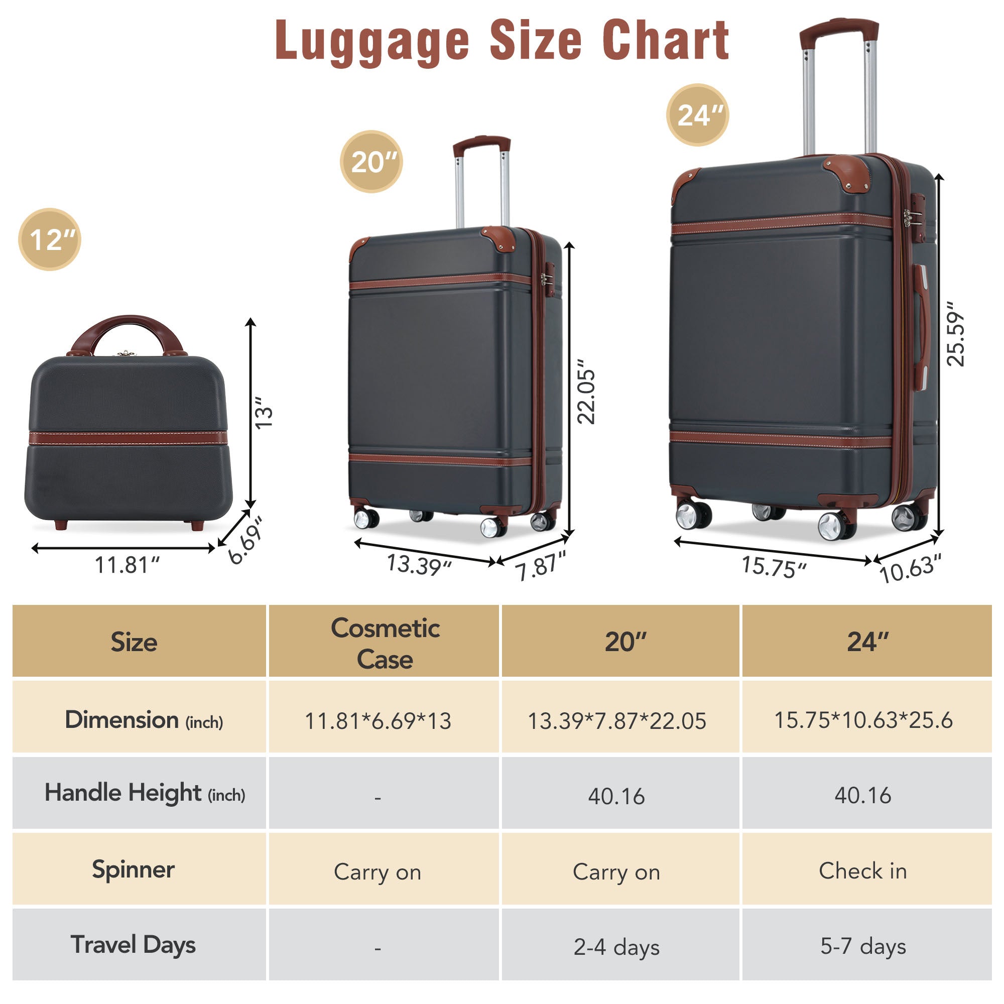 3 Piece Luggage Set Hardside Spinner Suitcase with TSA Lock 20" 24' Available. The 3 pieces set includes Cosmetic Case,20 inches and 24 inches luggages. One set just satisfies all your different travelling needs.