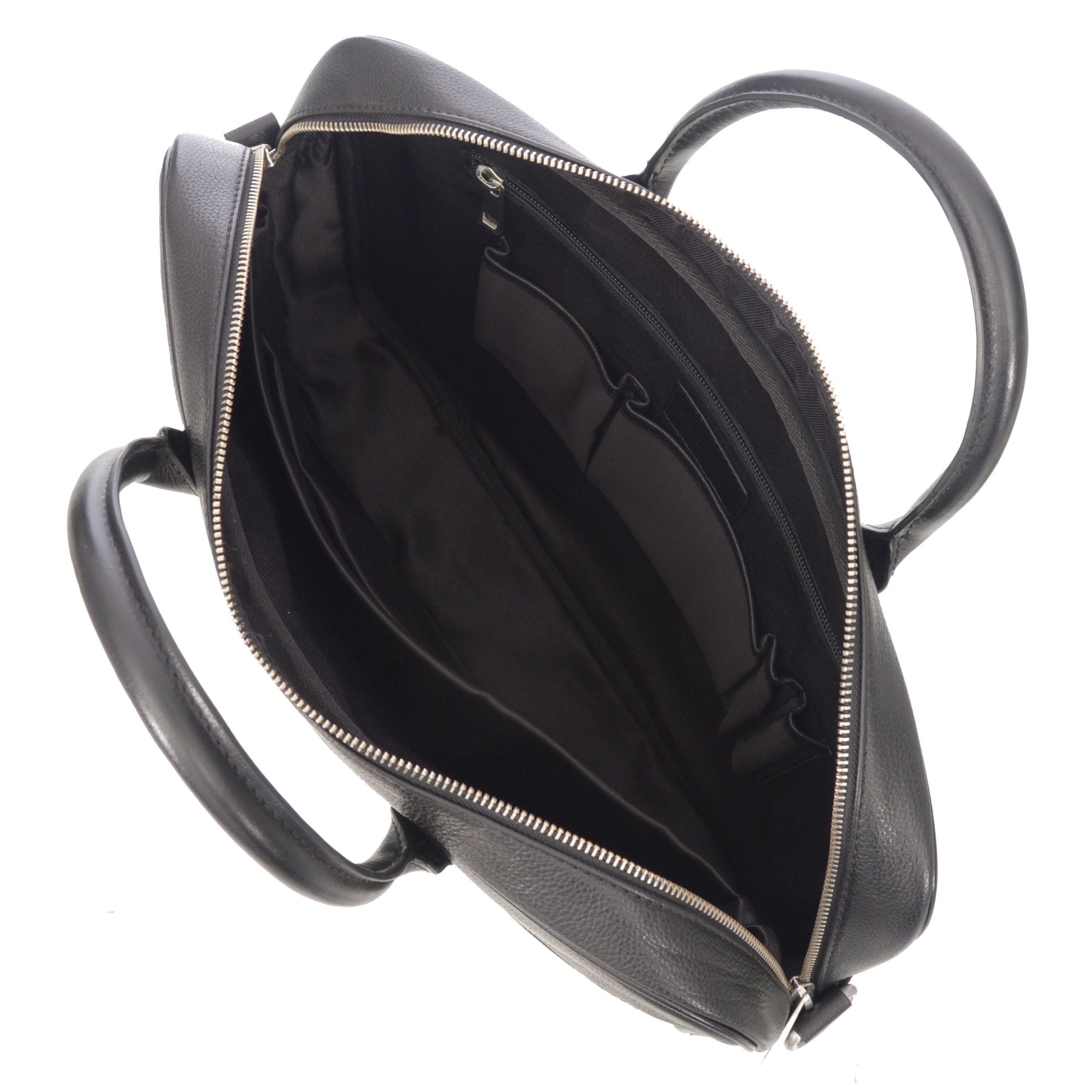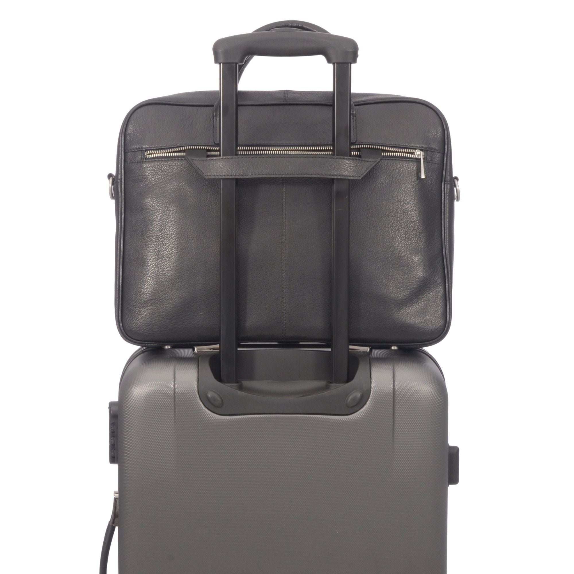 This convenient and practical, large capacity, leather messenger briefcase from Club Rochelier meets all your business and travel needs. Fabricated in Genuine textured leather and boasts a large interior compartment for documents, a padded laptop compartment, two accessories pockets and an interior zipper pocket. This bag is also the perfect travel buddy with the large back zipper pocket that contains a travel-buddy strap that attaches to the telescopic handle of most luggage. The adjustable and detachable strap allows for crossbody, shoulder or top handle carry.