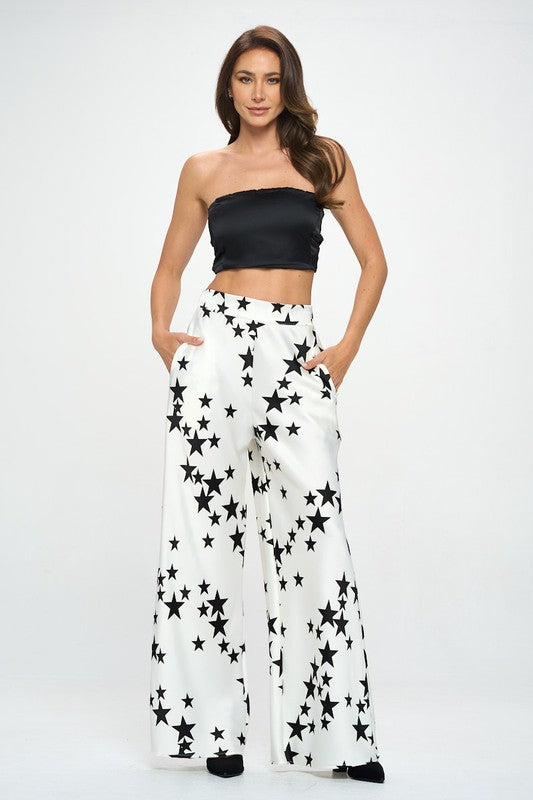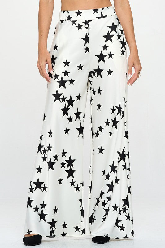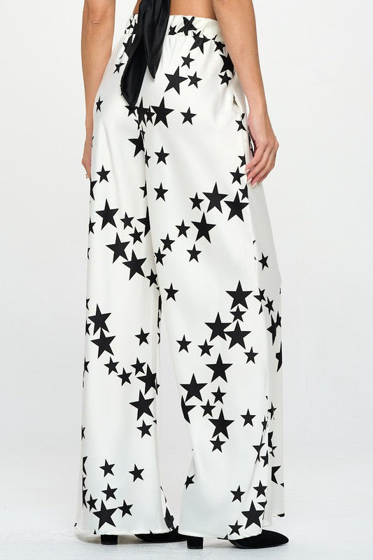 Made in USA Silky Satin Star Print Pants with Side Pocket. Fabric content: 97% Polyester, 3% Spandex.