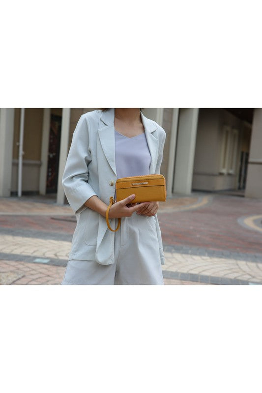 Made of high-quality vegan leather, a Fabric lining, and Designed with luxurious gold tone hardware, Top zipper closure, Decorative M keychain, Flat bottom matching Wallet with wristlet handle, Pebble texture, interior features a spacious compartment with a wall zipper pocket and two slip pockets, Exteriors feature a front wide slip pocket, Matching Wallet with a wristlet handle.