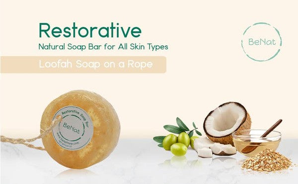 -NATURAL INGREDIENTS. Healthy-looking skin requires the best products in your daily routine. Restorative Soap Bar is the best way to cleanse and soothe your body. Enriched with natural ingredients like oat, olive, and coconut oil. This Soap Bar cleanses, exfoliants, and moisturizes naturally. The package includes a loofah and hanging cord.