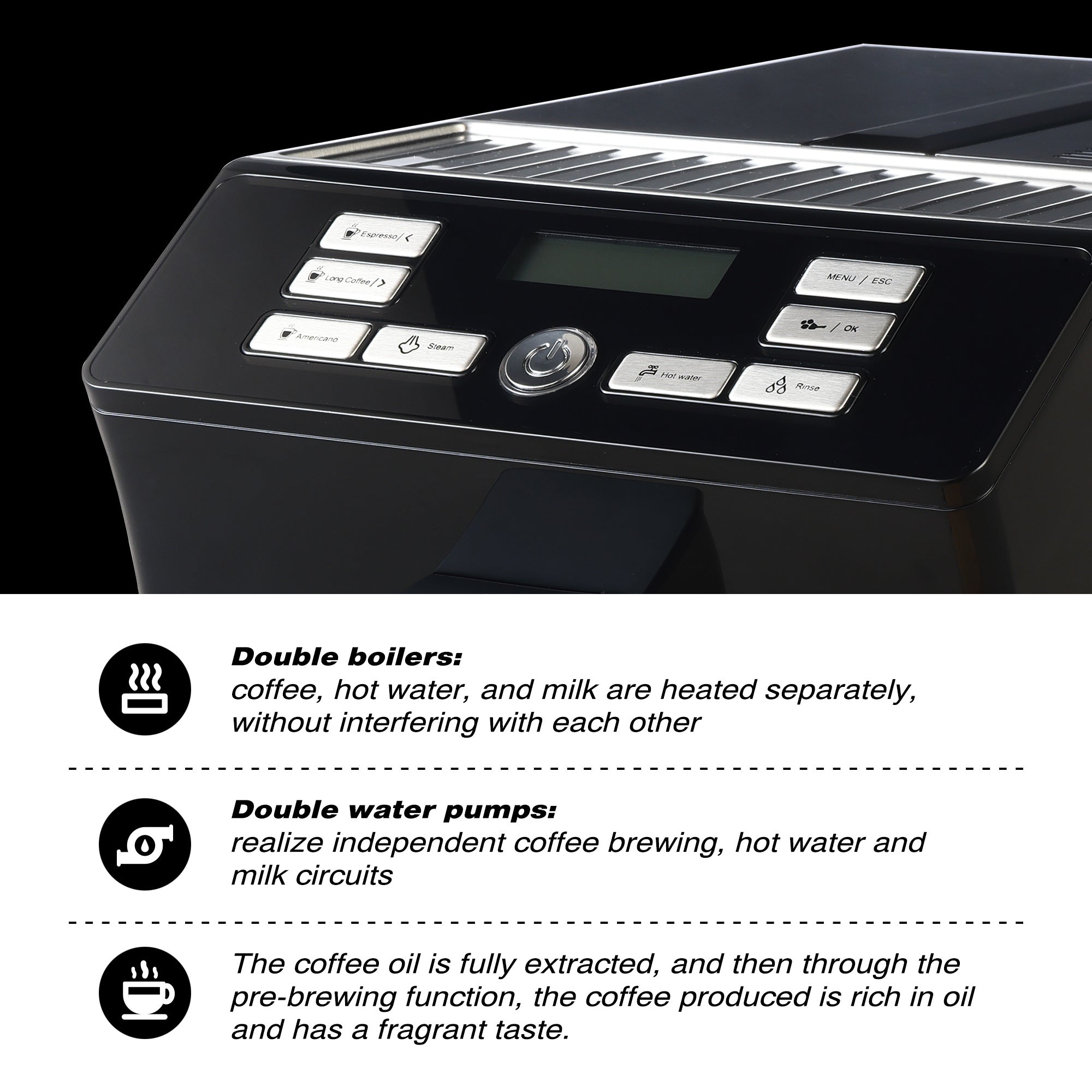 Intelligent Features & Customizable Settings:** With an automatic alarm for water and bean shortages, full coffee grounds tank indicator, and customizable beverage parameters, this machine is designed for your convenience. It also has a memory function to remember the number of beverages and rinses automatically when turned on and off.