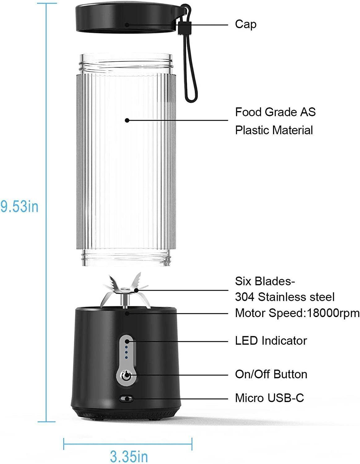 Portable & Large Capacity The capacity is 18oz (530ml), a perfect personal size to make shakes and smoothies, the juicer is big enough that will not leak the fluids. The blender design with an anti-slip lanyard that you can take anywhere and anytime.