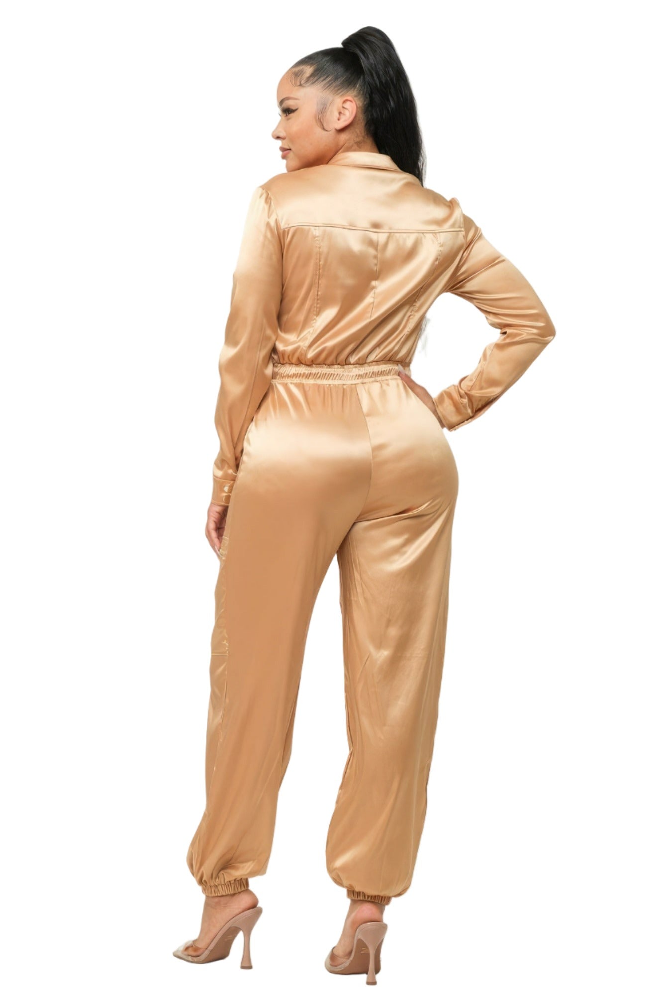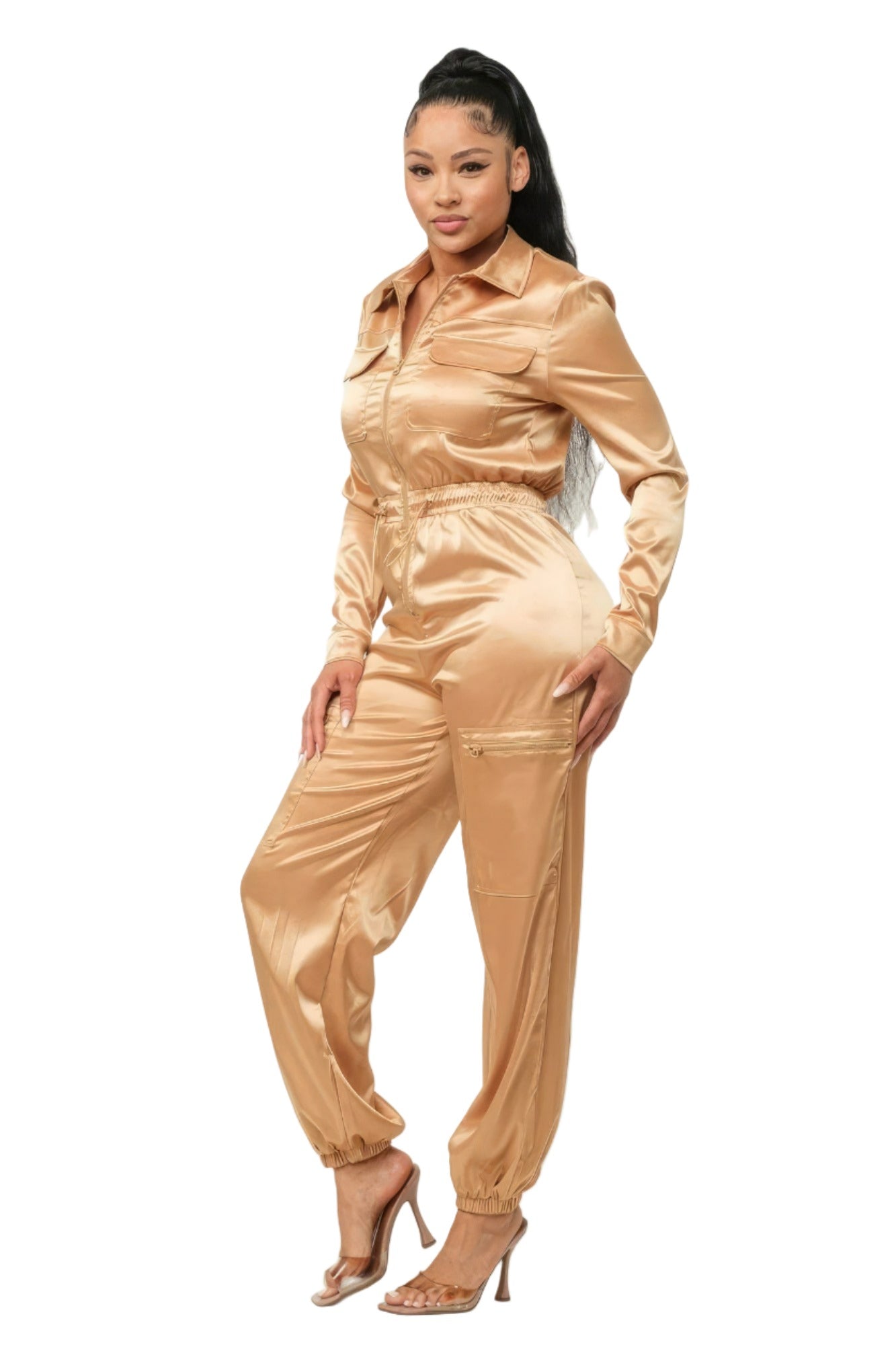 Elevate your glamour with our Gold Satin Solid Zipper Detail Jumpsuit, available in sizes S, M, and L. This chic ensemble features a collared long sleeve top with a front zipper and side pockets, paired with elastic waistband tie side zipper pockets detail jogger cargo pants for a modern and comfortable look.