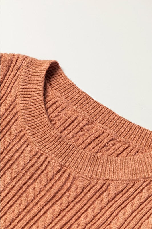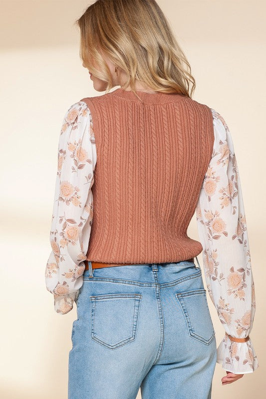 Floral Ruffle Cuff Sleeve Cable Knit Sweater