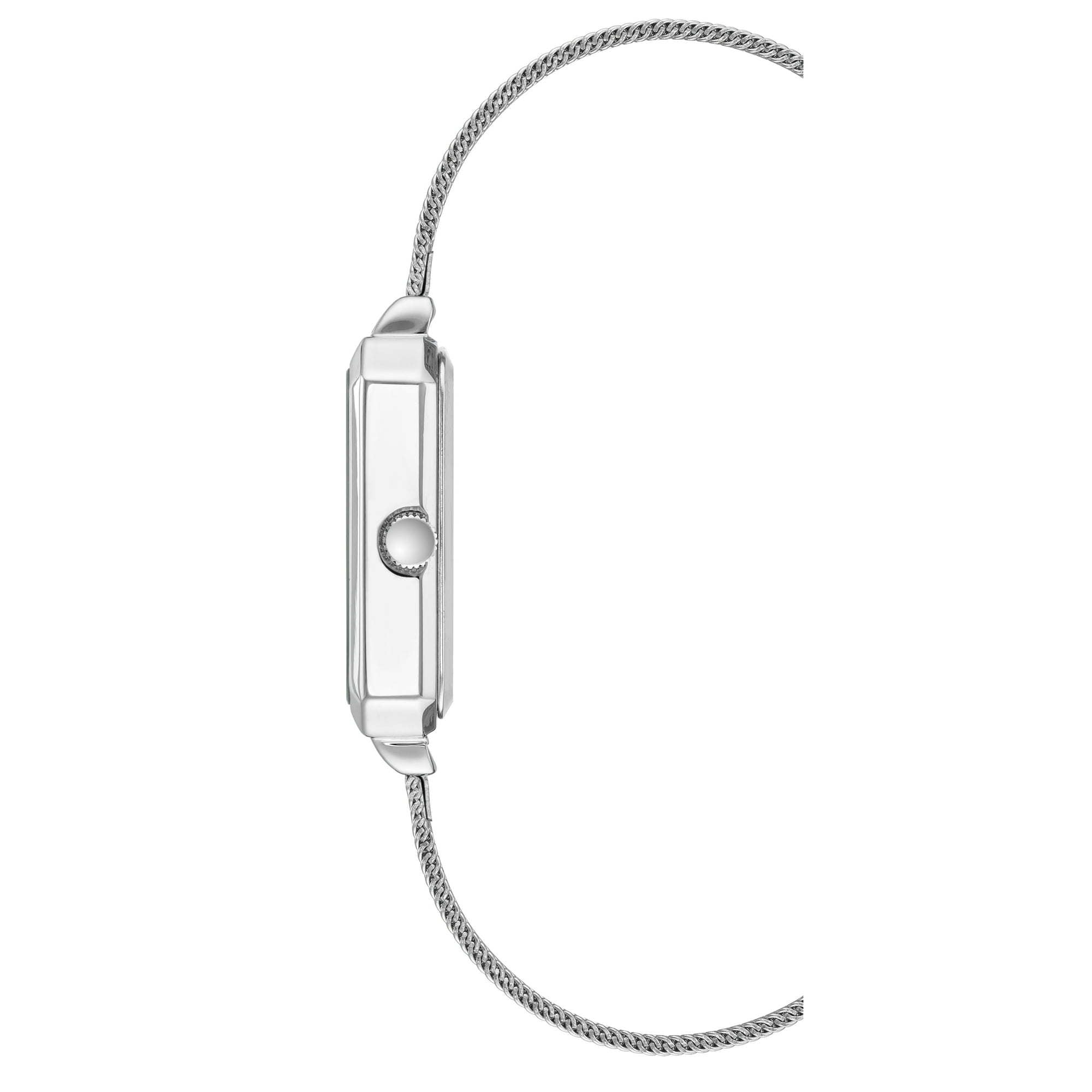 Exuding sophistication, this watch boasts a silver fine sunray dial complemented by Arabic numerals at 12, 3, 6, and 9. Paired with a stylish 12mm stainless steel mesh bracelet, the timepiece is further elevated by a brushed stainless steel adjustable sliding clasp, combining timeless design with modern comfort.