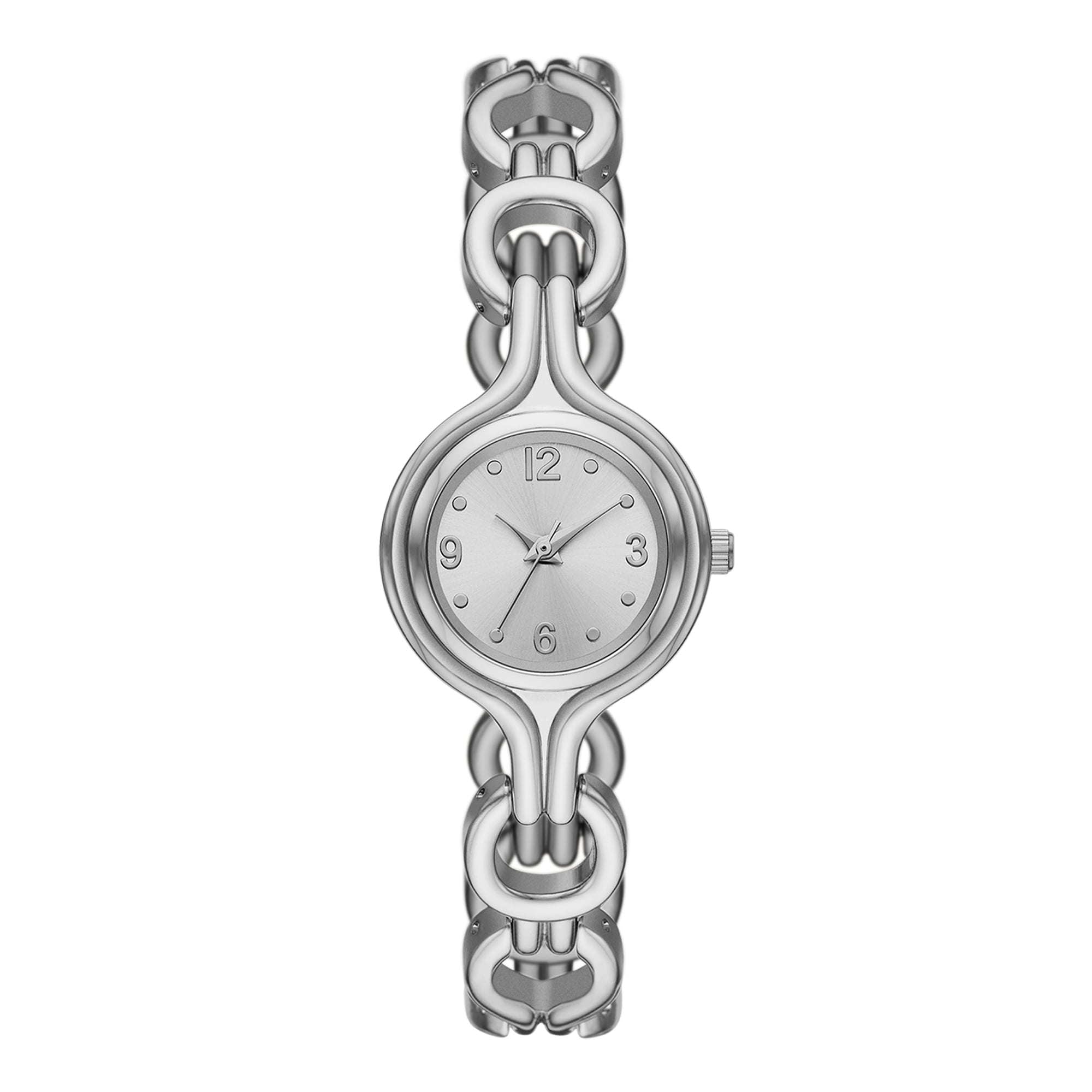 Elevate your style with our stunning timepiece featuring an interlocking stylized link bracelet, perfect for dressing up or down. Whether it's a night out or a day at the office, the feminine styling exudes a jewelry-like elegance. Whether worn alone or stacked with other chains and bangles, this versatile watch is destined to become your go-to accessory for any occasion, adding a touch of sophistication to your ensemble. Exclusively at Walmart.