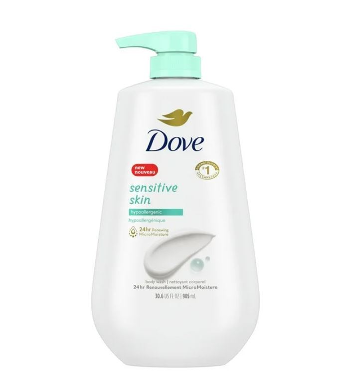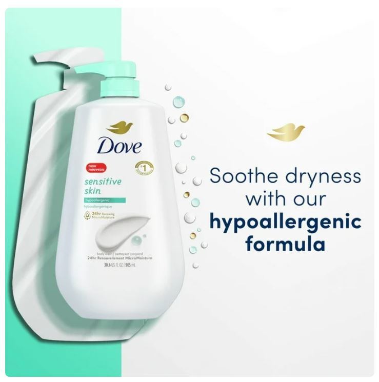 24HR RENEWING MICRO-MOISTURE: Dove Hypoallergenic Sensitive Skin Body Wash gently cleanses and nourishes the skin, leaving it renewed and healthy-looking for 24 hours