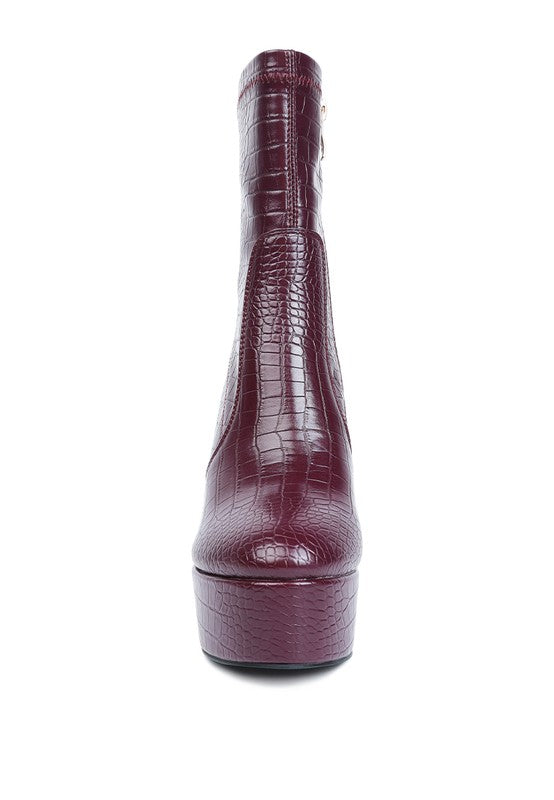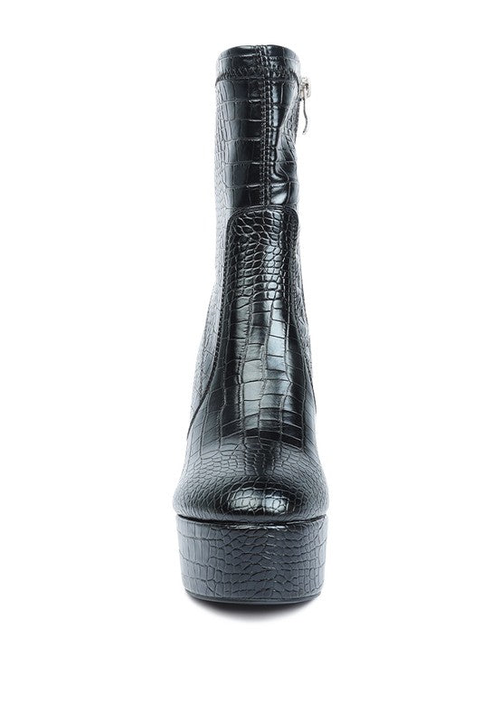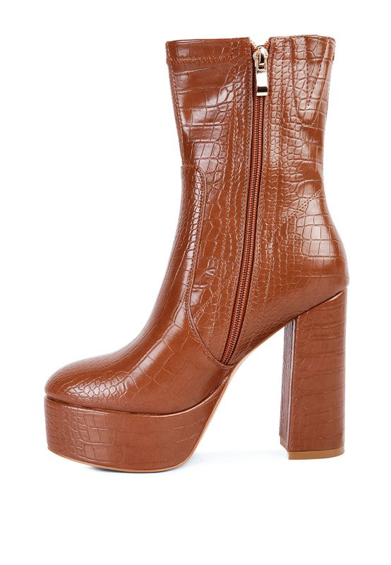 Pointed toe high block heel boot built on a raised platform, this ankle boot has gussets on the top adds to the fit. The back zipper opening makes it easy to wear.