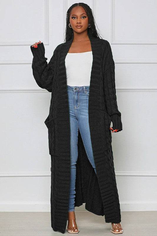 Sexy long maxi sweater cardigan, long sleeves with ribbed cuffs, open front , side pocket