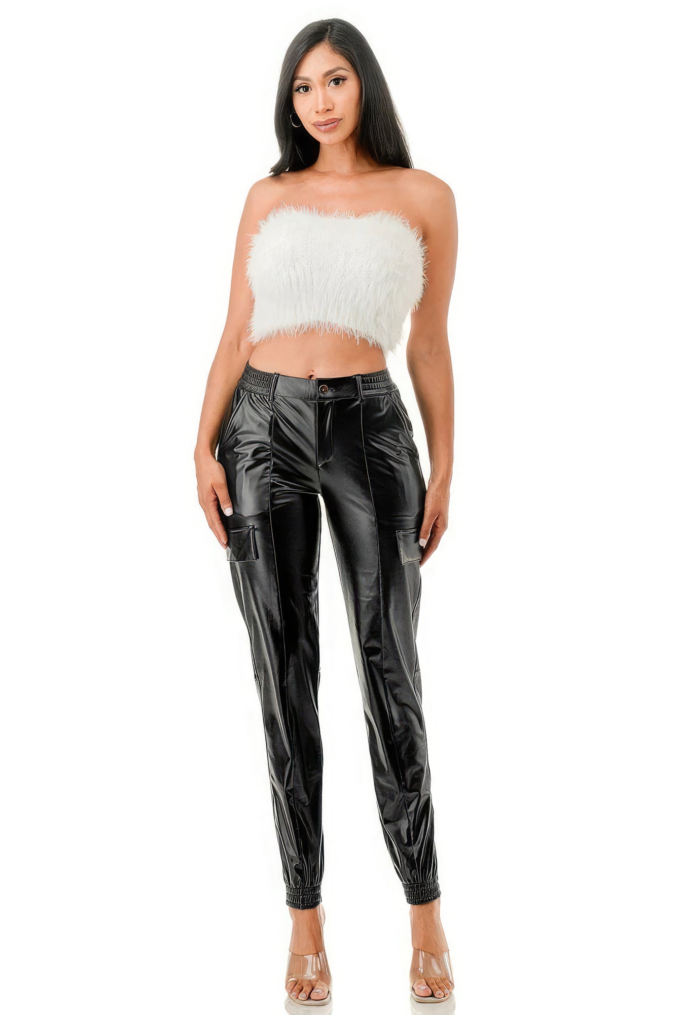 Revitalize your wardrobe with our Lined Fleece Faux Leather Cargo Pants in Black. Add them to your cart now and experience the perfect blend of comfort and edgy fashion!