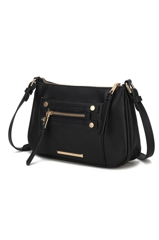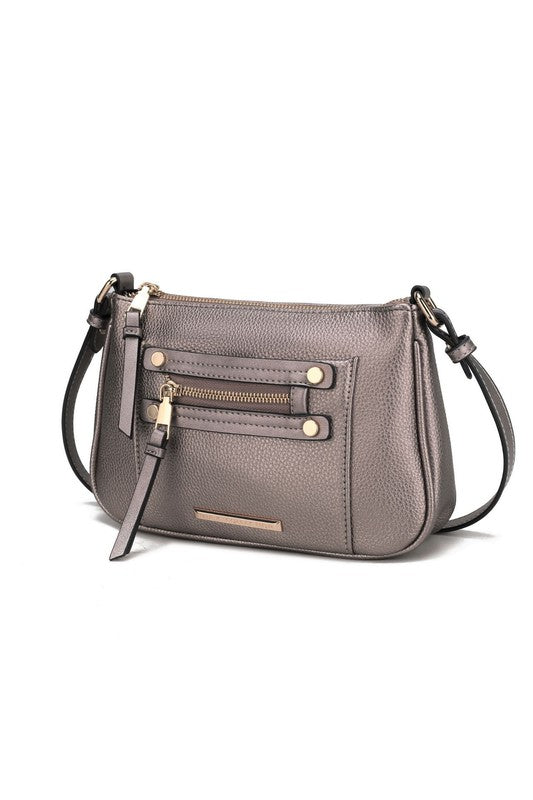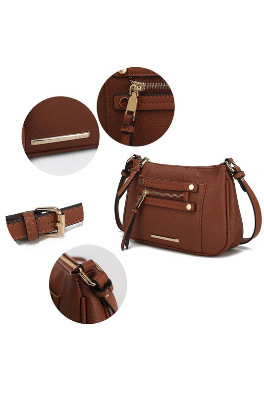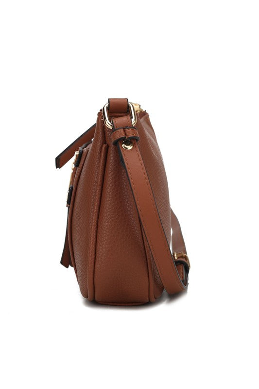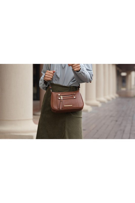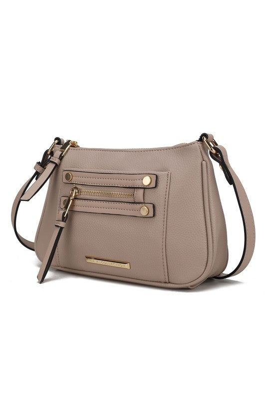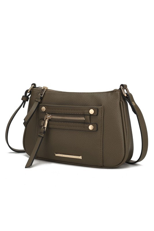 Crafted from soft pebble high-quality vegan leather and accented with gold-tone hardware, this crossbody is the perfect go-anywhere bag. Unzips it to reveal a fully lined interior with a wall zippered pocket. The Essie Crossbody has our plate emblem on the front, gold press studs, a decorative zippered front pocket, and a convenient front slip pocket to keep your small belongings. You will love to wear this hands-free style.
