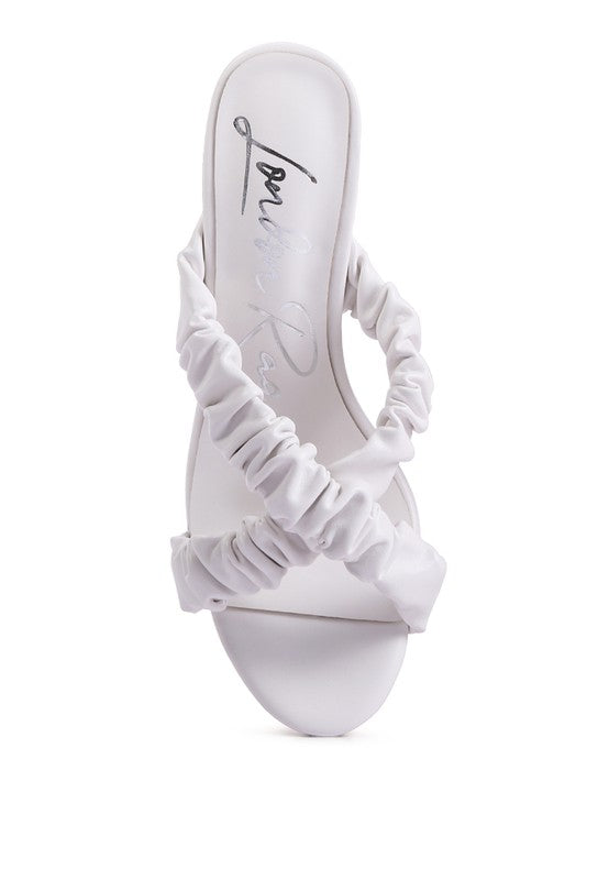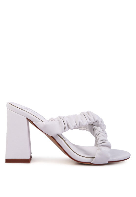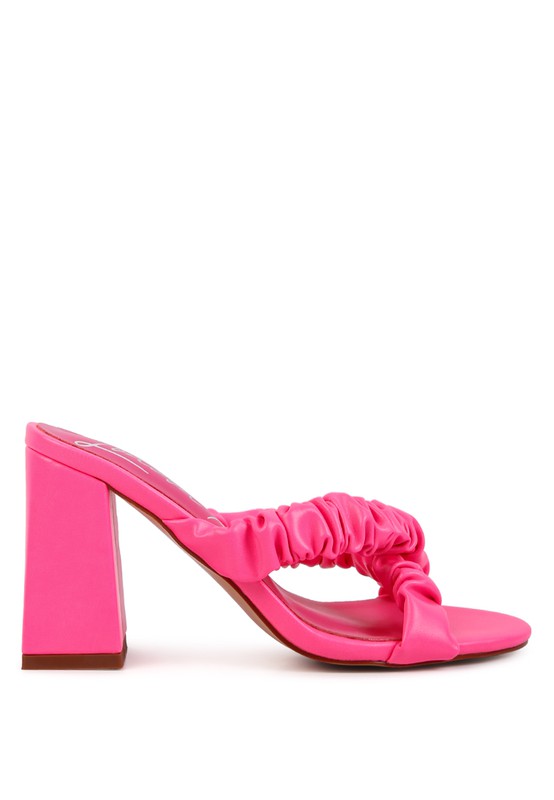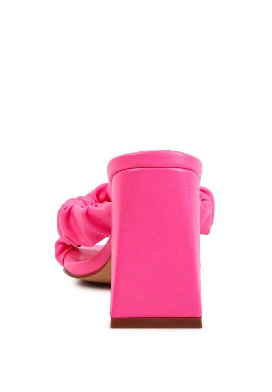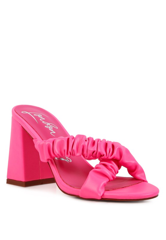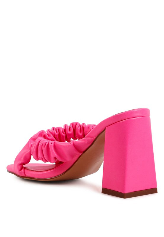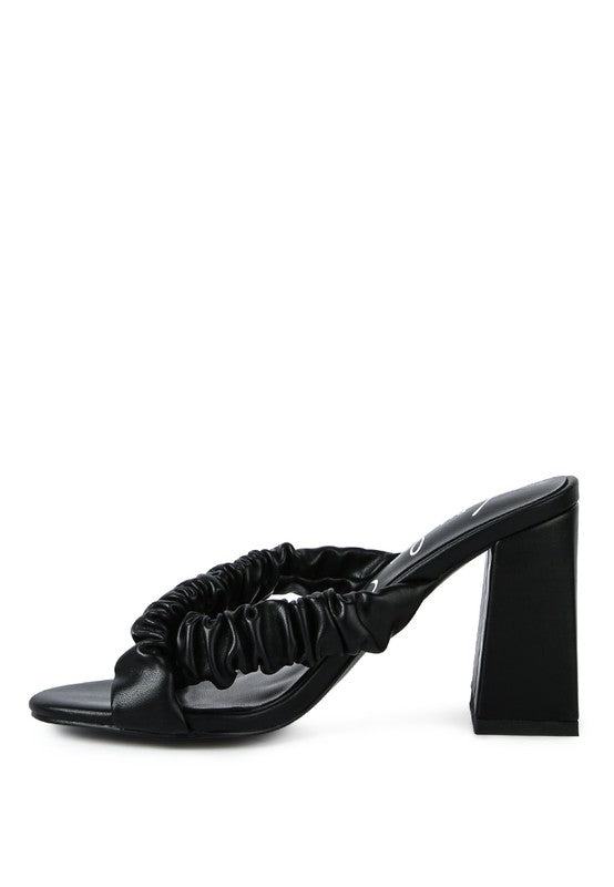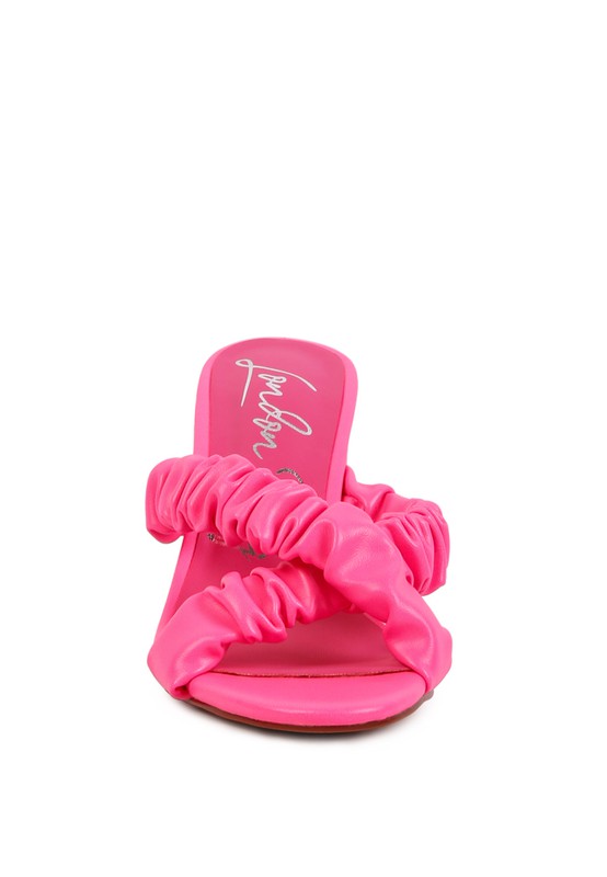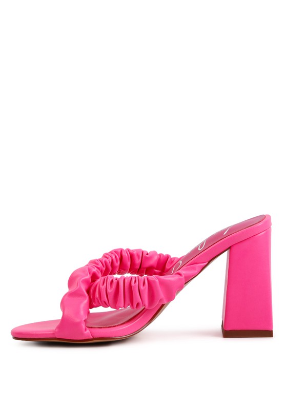 Cross strap trendy heels in gathered scrunchie style faux leather - has wide block heel which is comfortable. Crafted with great craftsmanship and superb finish, this pair on staple for summers!