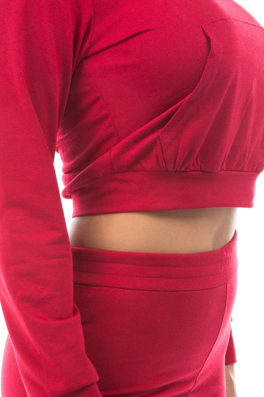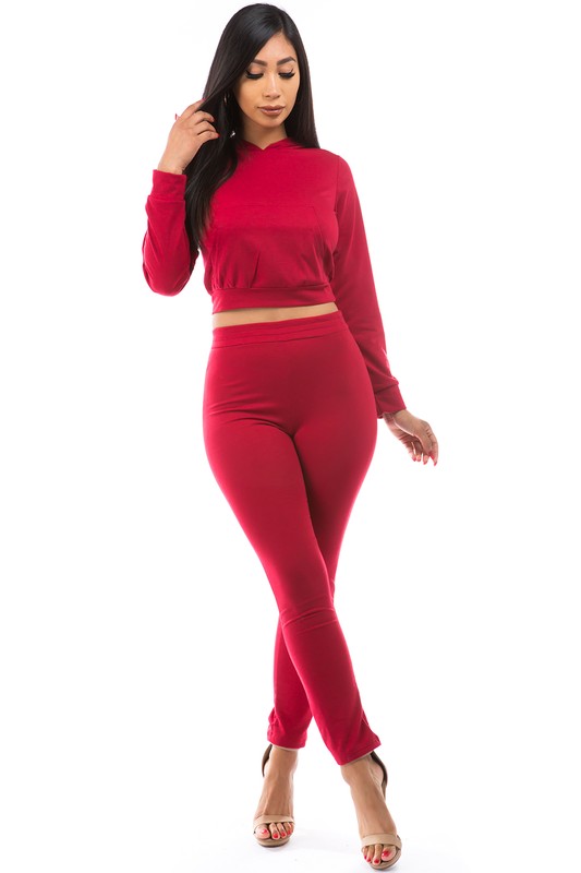Sexy casual suits ,attached hat ,long sleeves, front pocket ,elasticized waist pant back with strip (self strip )